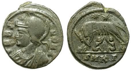 Rev. Romulus and Remus suckling from wolf, two stars above, SMKT in exergue.